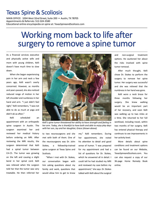 After much thought, Kelli chose Dr. Stokes to perform the surgery to remove her spine tumor. Her surgery was successful and she was relieved that the numbness in her hand was gone.
