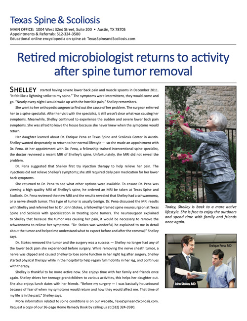 She returned to Dr. Pena to see what other options were available. To ensure Dr. Pena was viewing a high quality MRI of Shelley’s spine, he ordered an MRI be taken at Texas Spine and Scoliosis. Dr. Pena reviewed the new MRI and the results revealed that Shelley had a schwannoma, or a nerve sheath tumor. This type of tumor is usually benign. Dr. Pena discussed the MRI results with Shelley and referred her to Dr. John Stokes, a fellowship-trained spine neurosurgeon at Texas Spine and Scoliosis with specialization in treating spine tumors. The neurosurgeon explained to Shelley that because the tumor was causing her pain, it would be necessary to remove the schwannoma to relieve her symptoms. “Dr. Stokes was wonderful, he explained to me in detail about the tumor and helped me understand what to expect before and after the removal,” Shelley says.